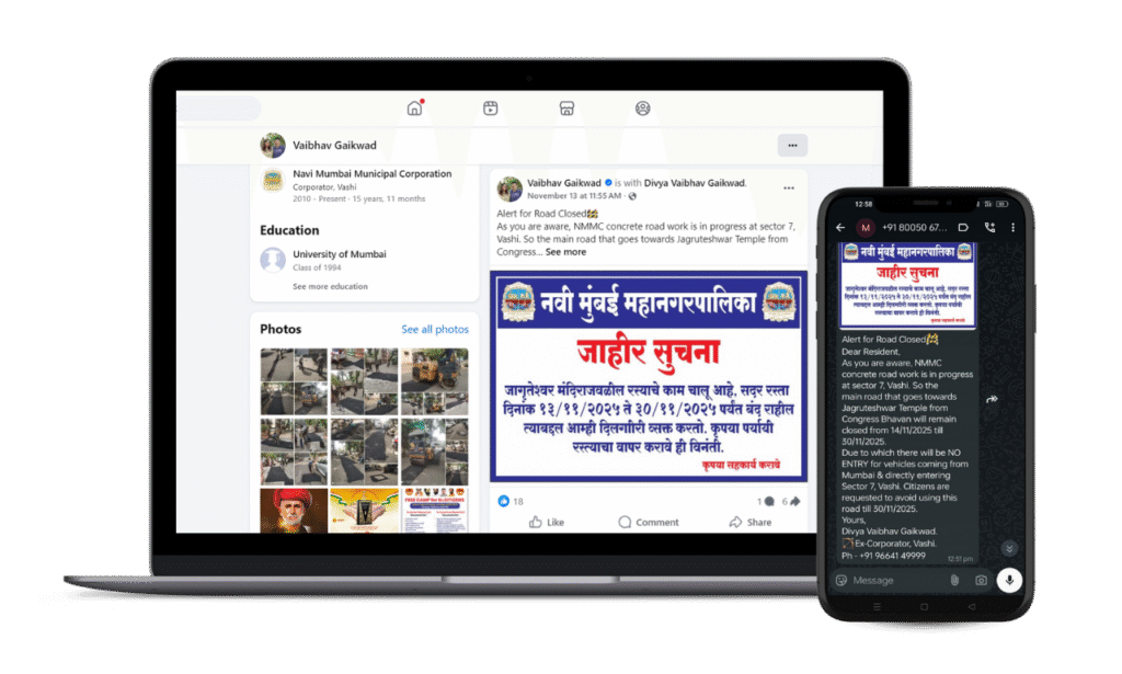Through regular SMS, calls, WhatsApp updates and digital platforms, Vaibhav Gaikwad ensures 9,000+ residents stay informed about: