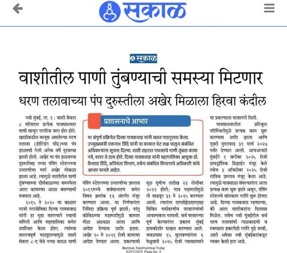 Thank you so much to all the print media for the deatil coverages. Divya Vaibhav Gaikwad @highlight #hardworkpaysoff #followup #Official #pumping #station #everyonefollowers #vashi #navimumbai