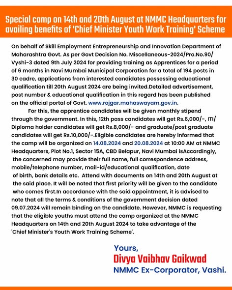 Special camp on 14th and 20th August 2024 at #NMMC Headquarters for availing benefits of ‘Chief Minister Youth Work Training’ Scheme. Detailed advertisement, post number & educational qualification in this regard has been published on the official portal of Govt :