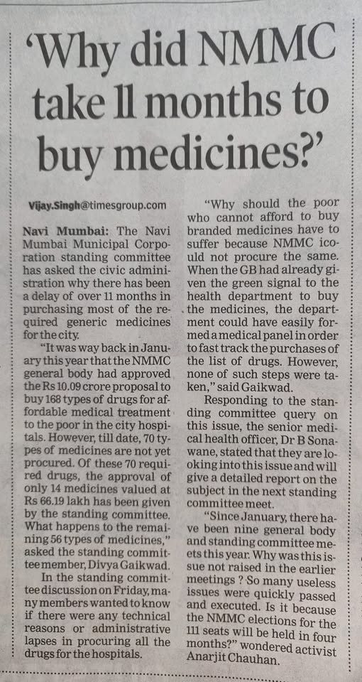 #Divya Gaikwad raised the issue in NMMC Standing Committee meeting & asked adminstration why delay in purchase of Medicines for NMMC Hospitals. Today’s TOI.