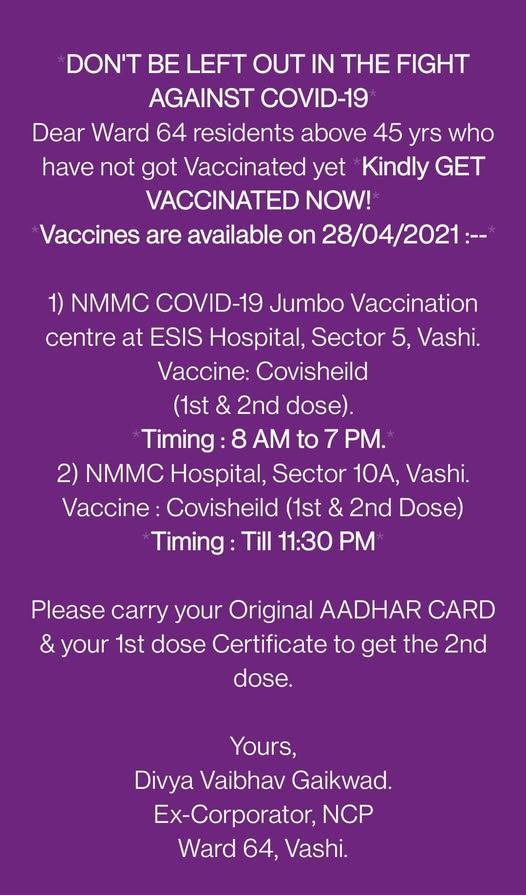Dear Ward 64 residents above 45 yrs who have not got Vaccinated yet Kindly GET VACCINATED NOW!