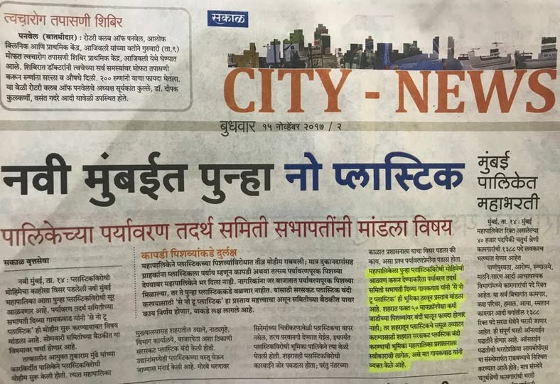 Civic Work UpdatesToday s article in the sakal news paper. say noByVaibhav GaikwadNovember 15, 20170Comments Grateful to share this update with our community. #Today’s Article in THE SAKAL news paper. “SAY NO TO PLASTIC”