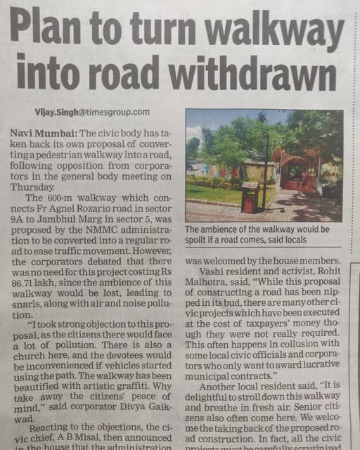 #Today’s TOI* reports on the proposal to build walkway into road at the NMMC General Body meeting where I had taken serious objection on the proposal of construction of new road connecting to Sacred Heart Church to Secttor 5.
